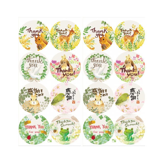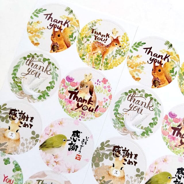 可愛い動物や草木が描かれたサンキューシールのセットです。