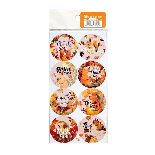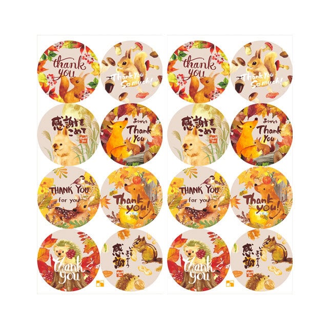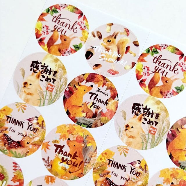 可愛い動物や草木が描かれたサンキューシールのセットです。