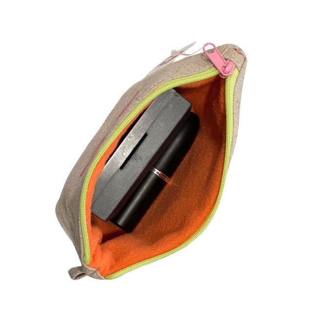 白い小籠包に水色のファスナー、内側は鮮やかなオレンジとビビッドな色合いが可愛い!