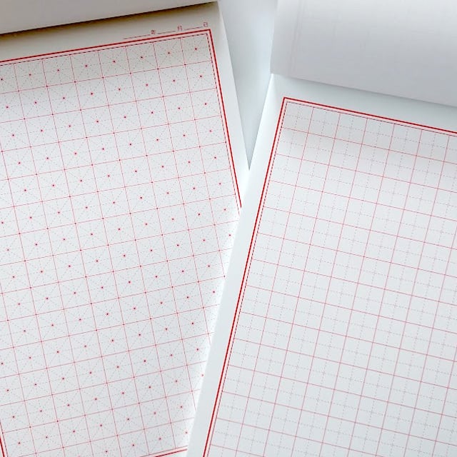 升目に格子(ガイドライン)が入っているのでが入っているので中心を決めて文字の間隔やバランスが取りやすくなっています。紙は日本の上質紙を使用。滑らかな書き味で滲みが少なく、裏染みがし難いので文字の練習に最適です。